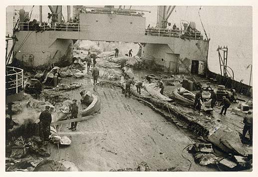 Zudem dehnten sich die Fanggebiete immer weiter aus. Bald gab es kein Gewässer mehr, in dem Wale noch sicher gewesen wären – nicht einmal in der Antarktis. 1910 gab es in diesem Bereich bereits sechs Walkochereien, 14 Fabrik- und 48 Fangschiffe. In jenem Jahr wurden über 10 000 Tiere erlegt. 1925 nahm das erste Walkochereischiff seinen Dienst auf, das seine Beute sogleich über eine Heckrampe an Bord zog und vollständig verarbeitete. Um 1930 gab es schon über 40 solcher ›Mutterschiffe‹. Allein zwischen 1925 und 1930 wurden über 75 000 Blauwale auf den Decks dieser „schwimmenden Kochereien” zerlegt.